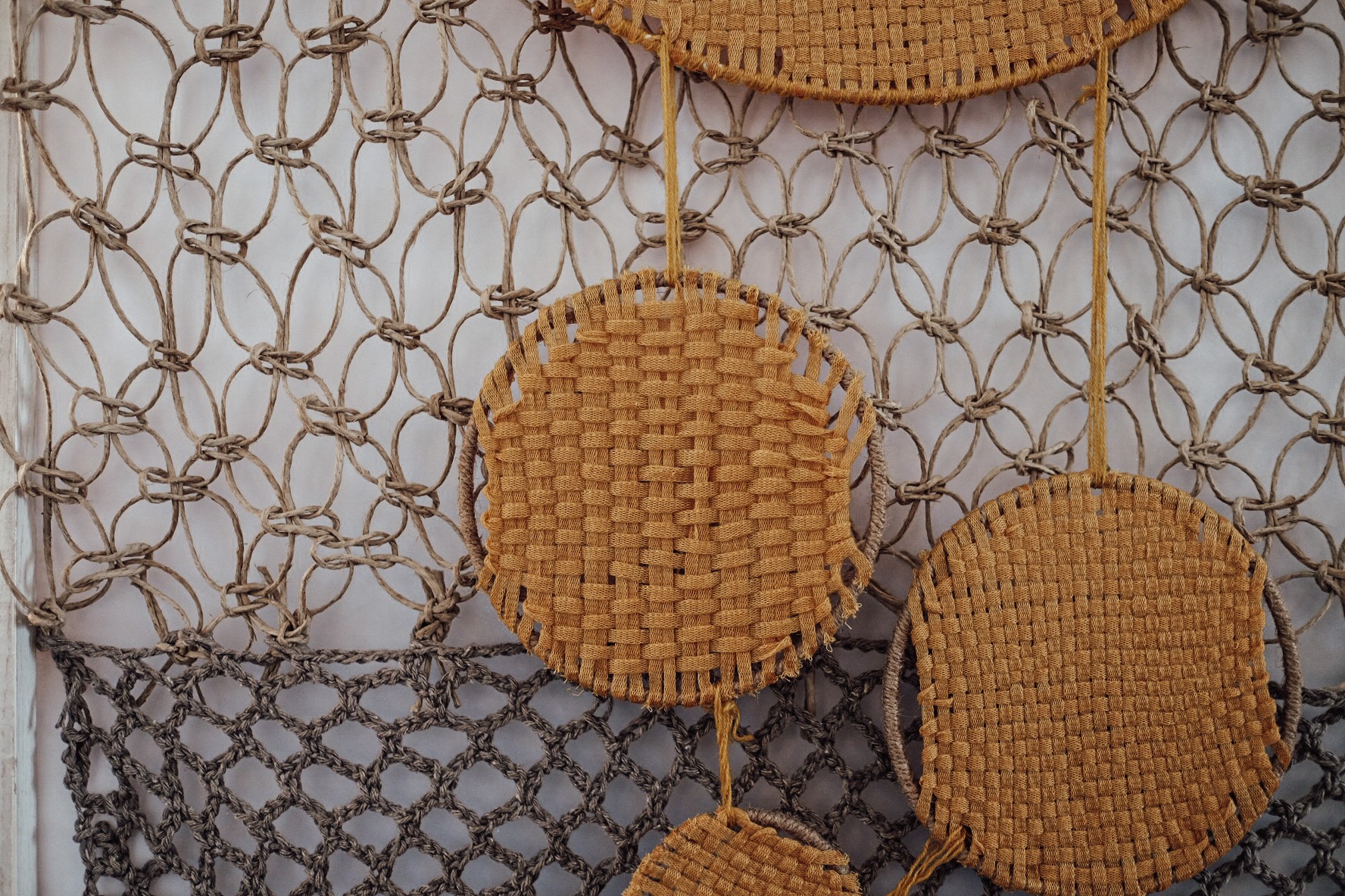 Students designed screens on the theme of the city and surroundings of Kranj and the heritage of sieves. Textile compositions in various combinations of hand techniques were created on wooden screens, reflecting the inspirations of Kranj, its inhabitants, history, architecture, nature, heritage, etc. The basic binding used is the canvas binding, in which the mesh screens are also woven, which represented the starting point for the design of the final product. Students explored a variety of hand techniques, from weaving, felting and knitting to macrame techniques. Many of the materials used are of natural origin; cotton, wool, rope, wood, metal. The colors are also in more subdued, natural tones.