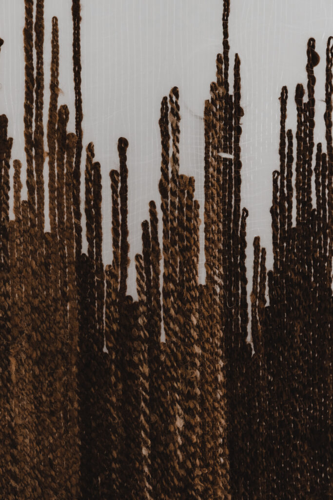 S predenjem, tkanjem in naravnim barvanjem Moa Bleyner Cederberg raziskuje materiale in spomin, v vlakna vpleta svojo osebnost, ki odražajo prisotnost, odsotnost in hibridnost. Delo Prostor med nitmi predstavlja idejo, da je identiteta – tako kot zrak – obenem bistvena in izmuzljiva: prežema nas, povezuje preteklost in sedanjost, a je nikoli ne moremo povsem doumeti.
