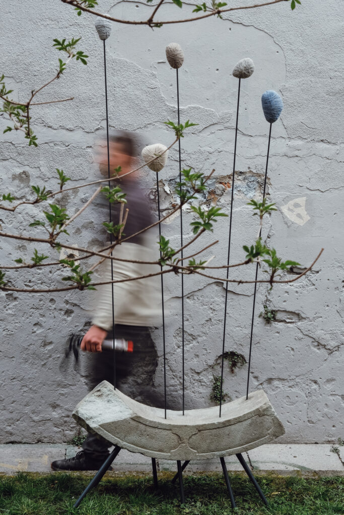 Ples arhitekturnega odmeva (2025); kamen, varjena kovinska struktura, volnena nit; 210 x 75 x 43 cm